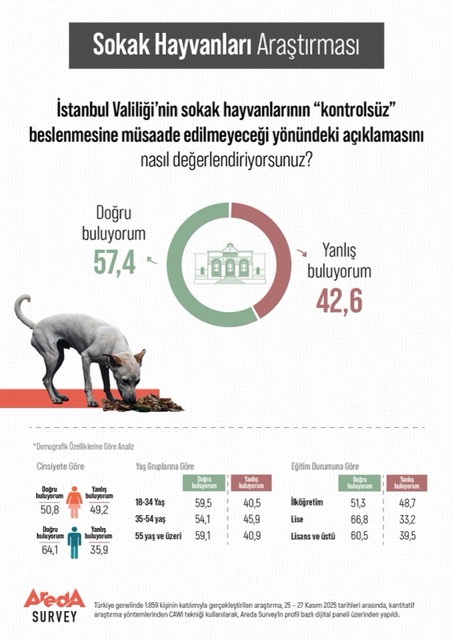 İstanbul Valiliği’nin sokak hayvanlarının kontrolsüz biçimde beslenmesine izin verilmeyeceğine yönelik açıklaması kamuoyunda geniş yankı uyandırırken, Areda Surveytarafından gerçekleştirilen araştırma toplumun konuya yaklaşımını ortaya koydu. Araştırmaya katılanların yüzde 57,4’ü uygulamayı doğru bulduğunu belirtirken, yüzde 42,6’sı ise yanlış bulduğunu ifade ediyor.